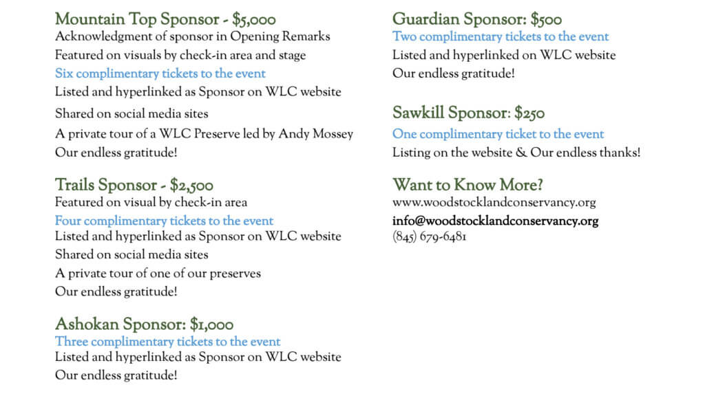Join us as a sponsor for WLC’s 14th annual Vernal Fling. Proceeds enable the continuation of our vital work in land, watershed and habitat protection as well as the development of educational and outreach programs designed to bring people of all ages, particularly children, closer to nature.